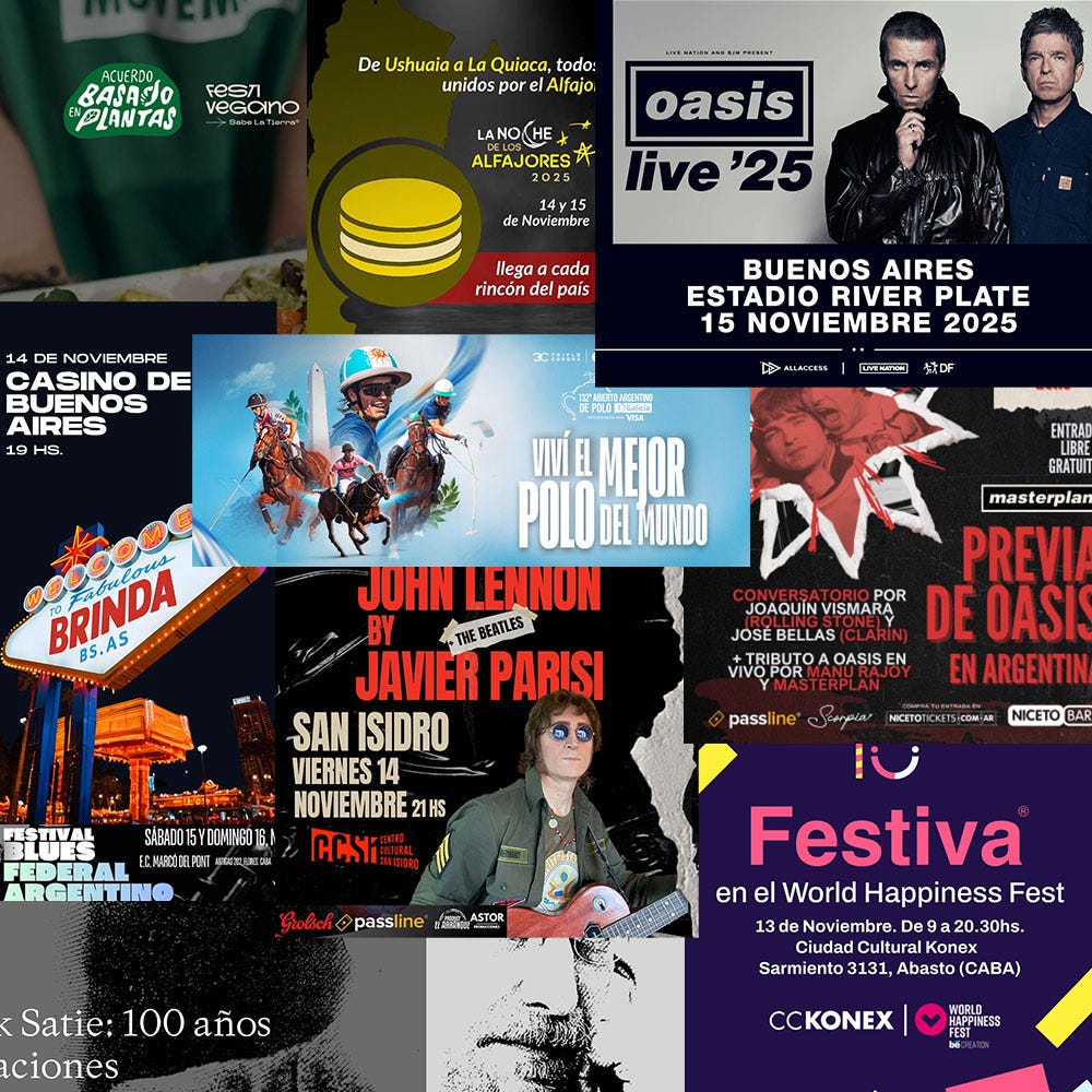 This Weekend in Buenos Aires Nov. 14th🎸🎹🏇🏼Oasis Concerts, 24-hour Satie piano at Teatro Colón, Polo & more.Buenos Aires PortalNov 14, 202541ShareThis Substack is reader-supported. To receive new posts and support our work, consider becoming a free or paid subscriber.SubscribeShareAll WeekendFestiveganoArt MastersBlues FestivalErik Satie 24 hours continuous piano at Teatro ColónPalermo Polo Tourneyment FridayThe wine store nightFeria FestivaAlfajor NightOasis Party in Niceto ClubJohn Lennon impersonatorWine Tasting at Buenos Aires CasinoSaturdayOasis Concert at River PlateItalian Food FairMozzarella around the world Pizza festBilly Idol ConcertAlfajor NightSundayOasis Concert at River Plate